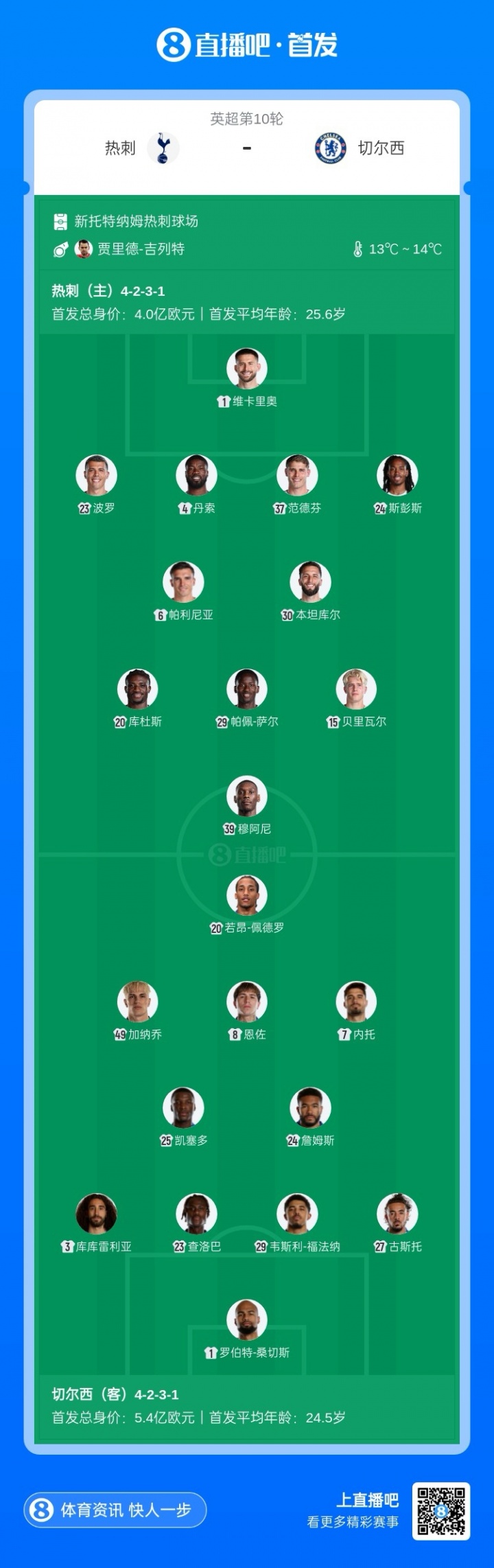 热刺vs切尔西首发:穆阿尼pk佩德罗,加纳乔、恩佐、凯塞多出战